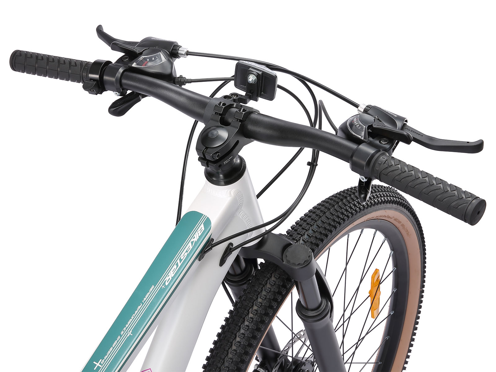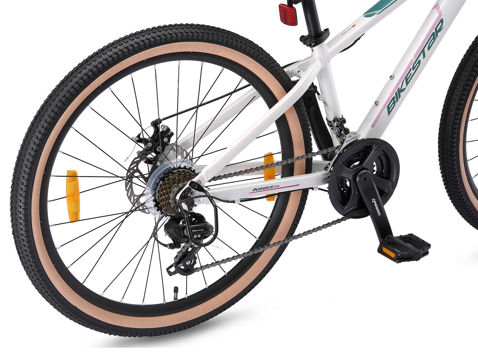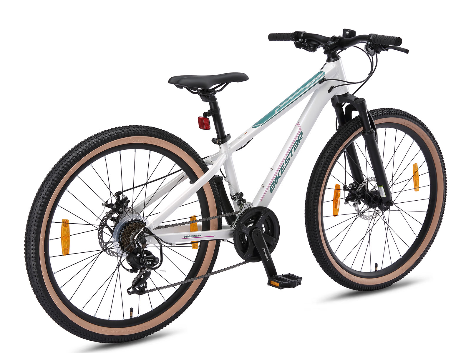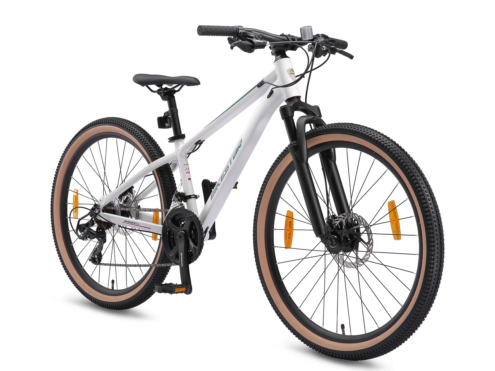 **Prima mountainbike** Zeer stabiel aluminium frame voor dagelijks gebruik op de berg, in de stad of op school. Met een bandenmaat van 26 inch en framemaat 13 inch is hij geschikt voor jongens en meisjes van ca. 141 tot 155cm. Met het 21-speed Shimano derailleur-systeem met bijna naadloze schakeling kun je elke situatie aan. Mechanische schijfremmen aan de voor- en achterkant zorgen voor de nodige controle. De fiets heeft een geveerde voorvork met 90 mm veerweg.