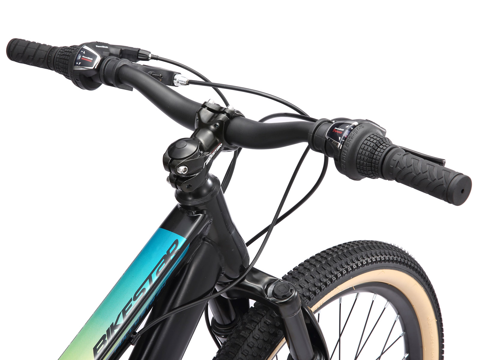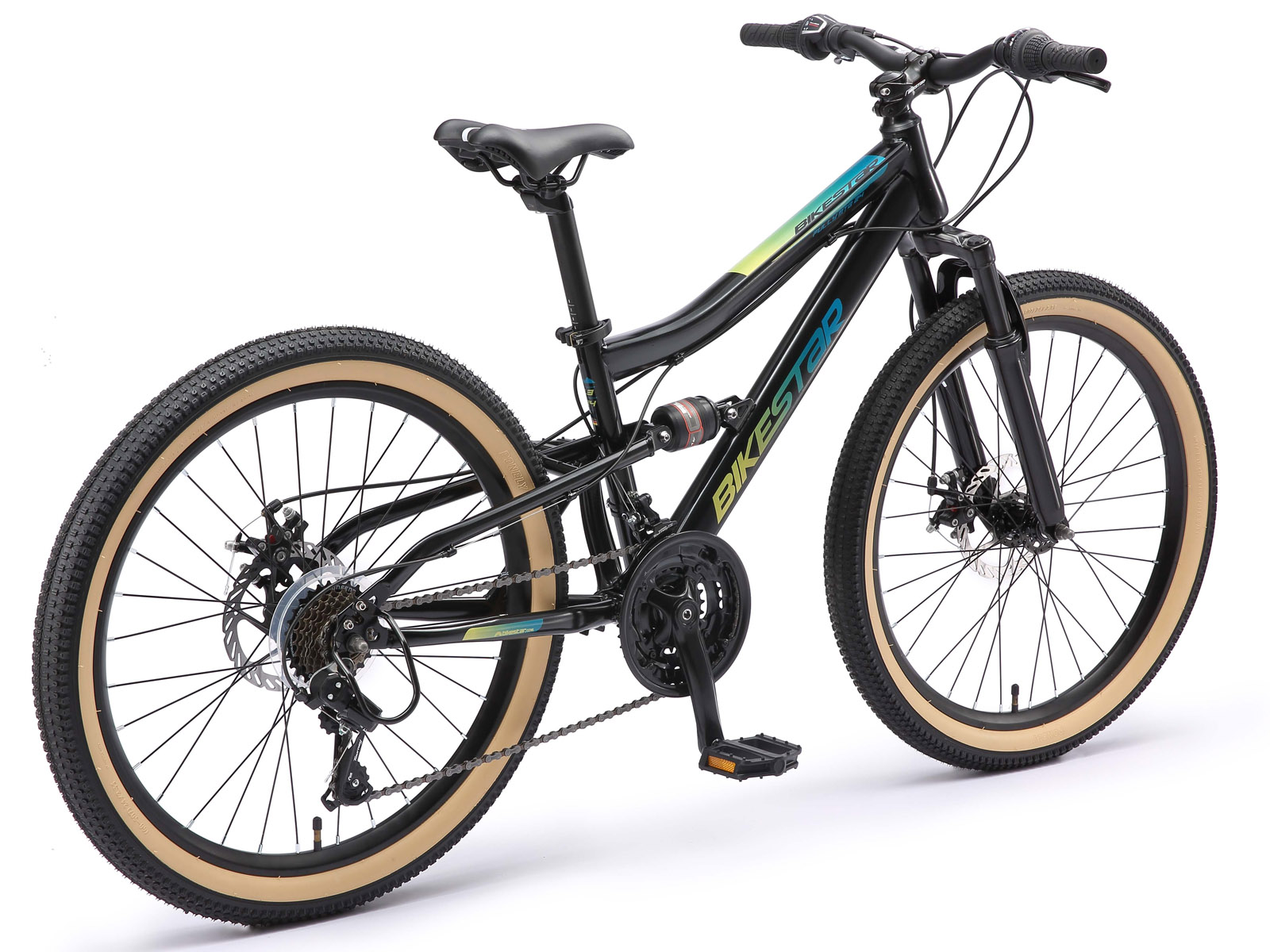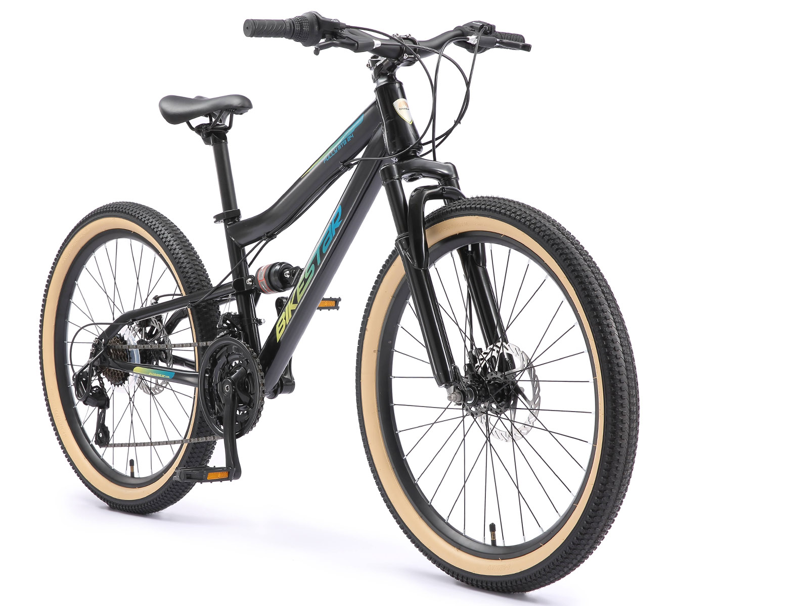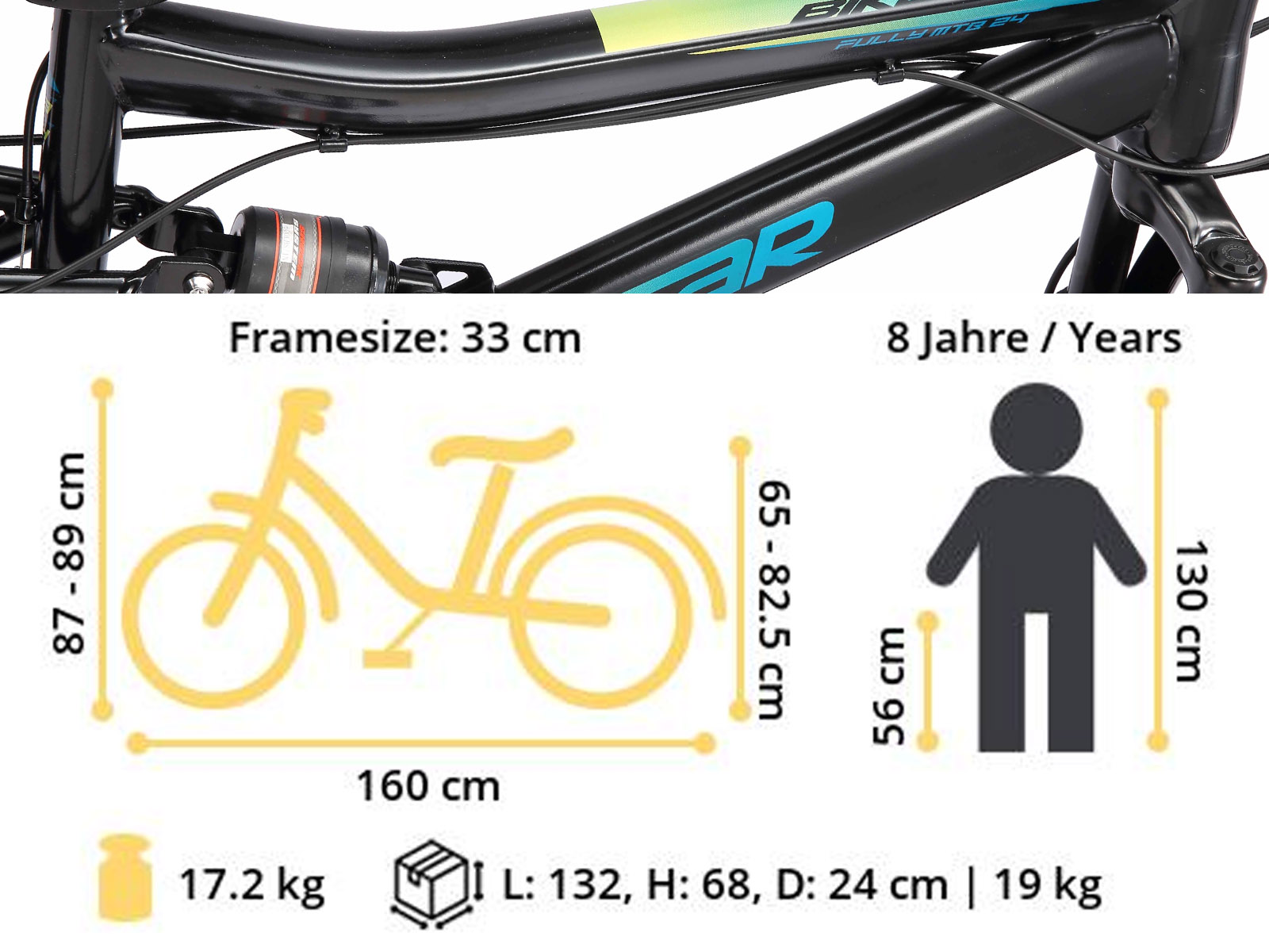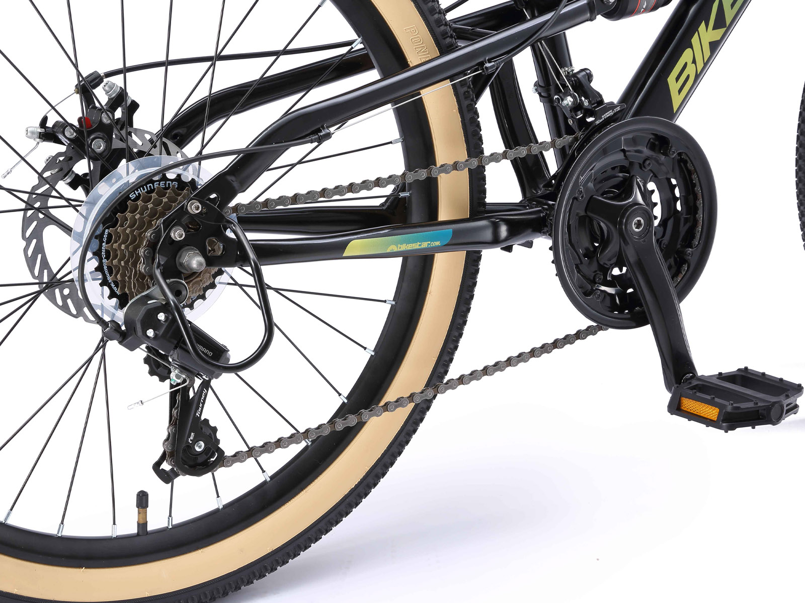 **Full suspension mountainbike** Zeer stabiel aluminium frame voor dagelijks gebruik op de berg, in de stad of op school. Met een bandenmaat van 24 inch en framemaat 13 inch is hij geschikt voor jongens of meisjes, vanaf ca. 135cm. Met het 21-speed Shimano derailleur-systeem met bijna naadloze schakeling kun je elke situatie aan. De bijzonder gripvaste schijfremmen aan de voor- en achterkant zorgen voor de nodige controle. De fiets heeft een geveerde voorvork met 55 mm veerweg en een geveerde achterbrug.