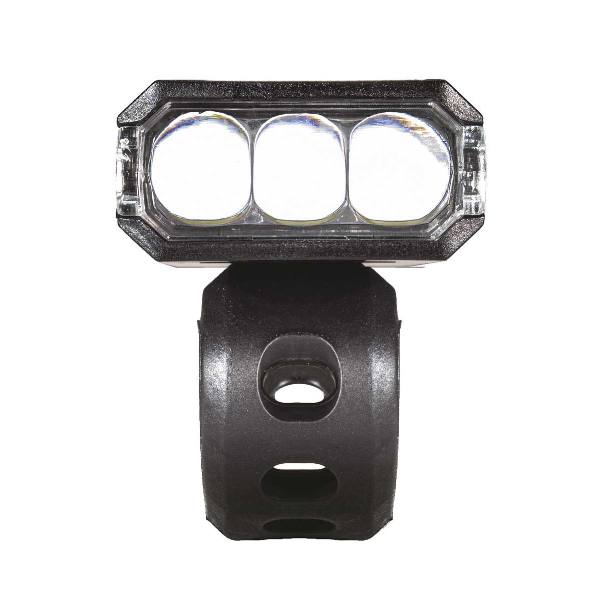 Met deze oplaadbare koplamp wordt je gezien en zie je zelf ook nog wat van de weg voor je. Opladen neemt ca 2 uur in beslag, daarna kun je met 200 lumen je route verlichten. Dit superlichtgewicht 25 gram model is voorzien van 3 super bright white LED lampen en een aluminium behuizing. Je monteert de lamp met een flexibele band aan het stuur, die je er voor het opladen en tegen diefstal gemakkelijk afgespt.