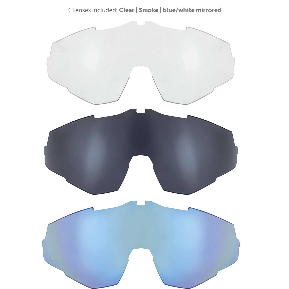 Comfortabele fietsbril met 3 sets glazen: helder, donker en spiegeleffect blauw/wit. UV400 bescherming, hypoallergeen en slechts 36 gram.