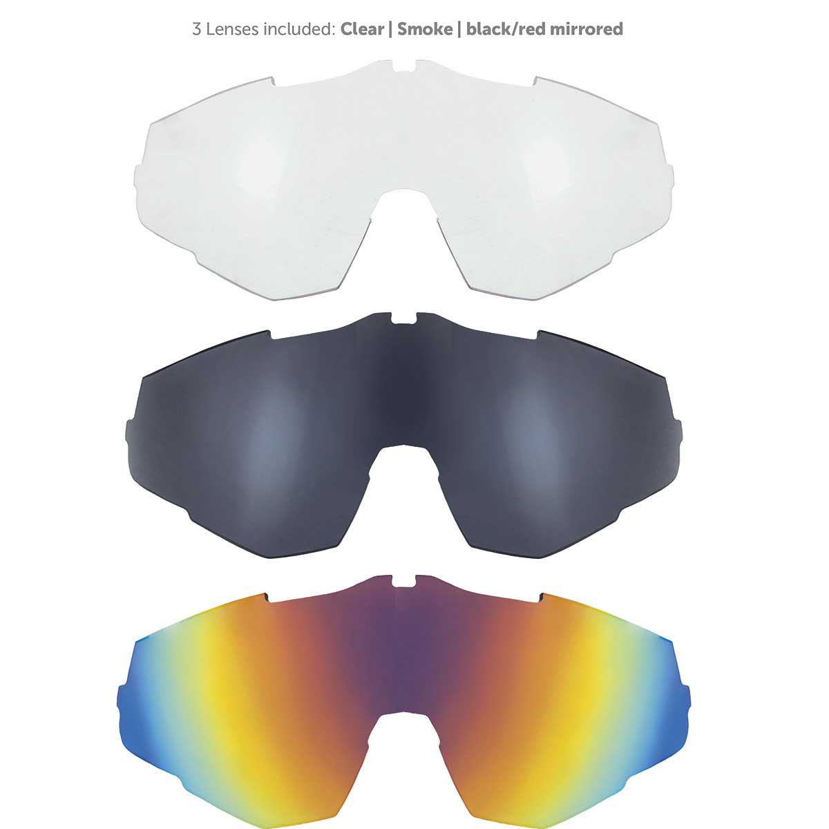 Comfortabele fietsbril met 3 sets glazen: helder, donker en spiegeleffect zwart/rood. UV400 bescherming, hypoallergeen en slechts 36 gram.