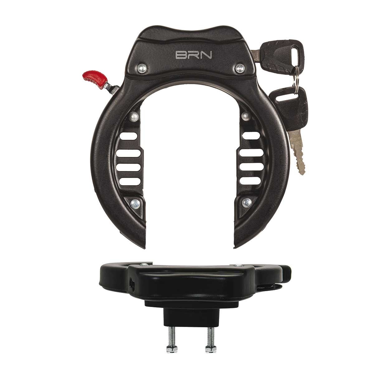 Sterk stalen ringslot voor montage op het frame. Inclusief 2 sleuteltjes en 2 boutjes voor de montage. Let op, dit slot heeft geen ART vermelding en is daardoor niet geaccepteerd door de verzekering.