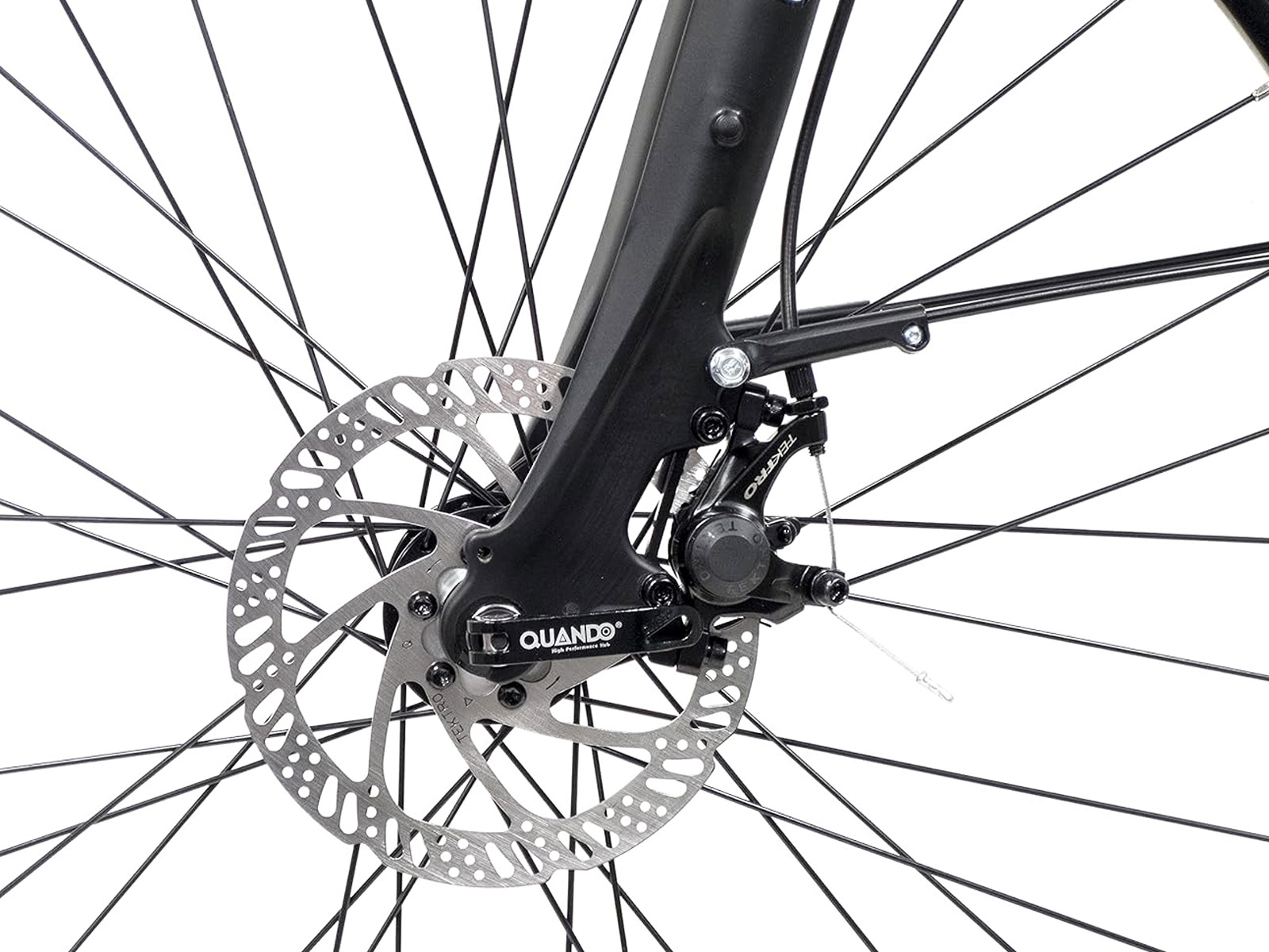 De geveerde voorvork vangt de klappen op als je over hobbelige wegen fietst. Het aluminium frame is voorzien van een bovenbuis, maar dat wil niet zeggen dat deze fiets alleen voor mannen is gedacht. Wel geeft de bovenbuis extra stabiliteit aan het frame, waardoor je snel en accuraat kunt sturen en de fiets ook op hoge snelheid heel solide aanvoelt. De 28 inch aluminium dubbelwandige velgen zijn voorzien van 38 mm brede banden met reflectiestrepen en binnenbanden met autoventielen. Kunststof spatborden houden opspattend water en straatvuil tegen, zodat je de fiets met een gerust hart ook kunt gebruiken voor woon-werkverkeer.