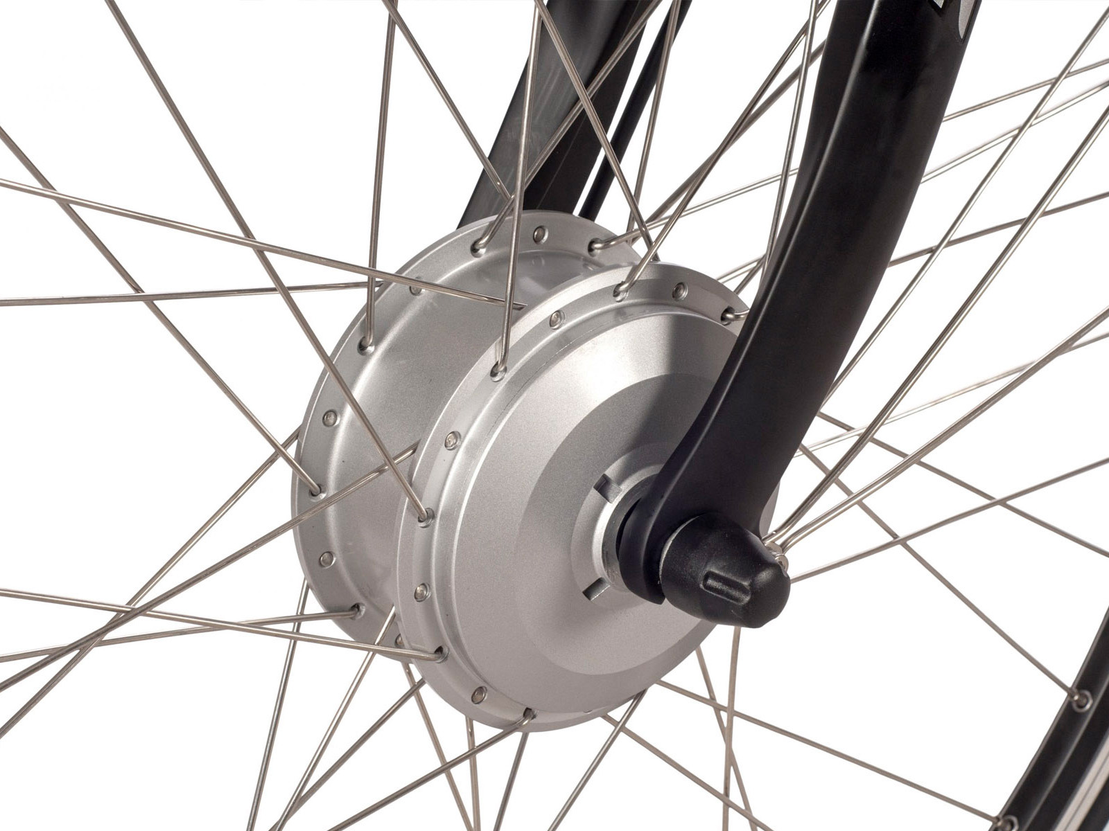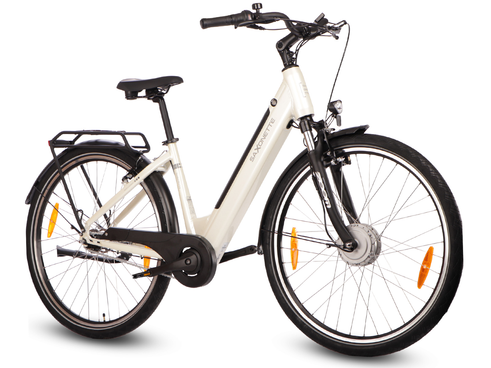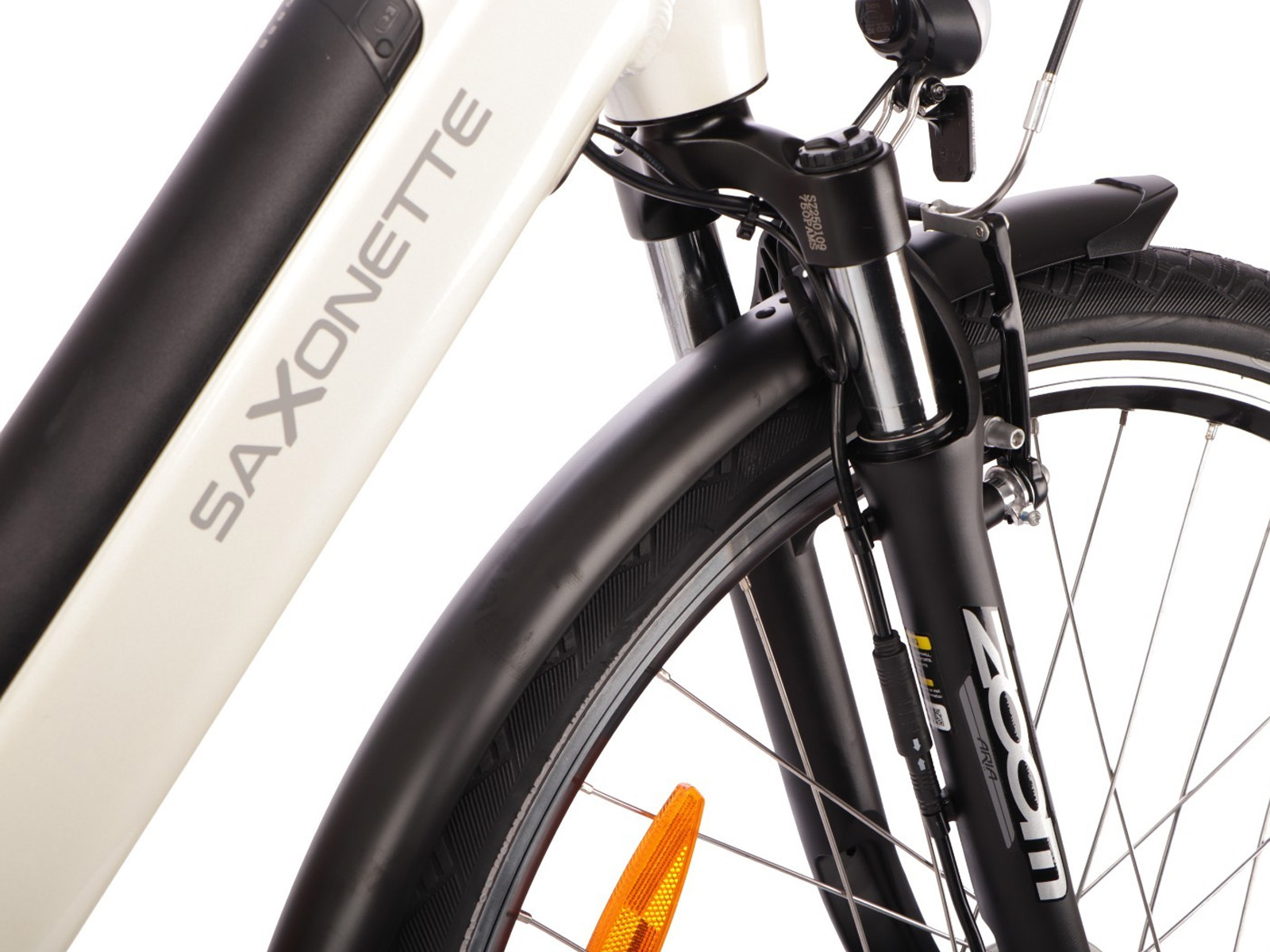 Het lage instapframe met een zadelbuislengte van 45 cm is afgewerkt met een elegante cremewitte glanslak. Dat deze ebike in Duitsland is ontwikkeld merk je aan de gebruikte onderdelen, zoals de robuuste verende voorvork, maar vooral aan het feit dat de fiets is voorzien van zowel V-brakes als een terugtraprem. Zekerheid voor alles, zoals ook blijkt uit de goede verlichting.