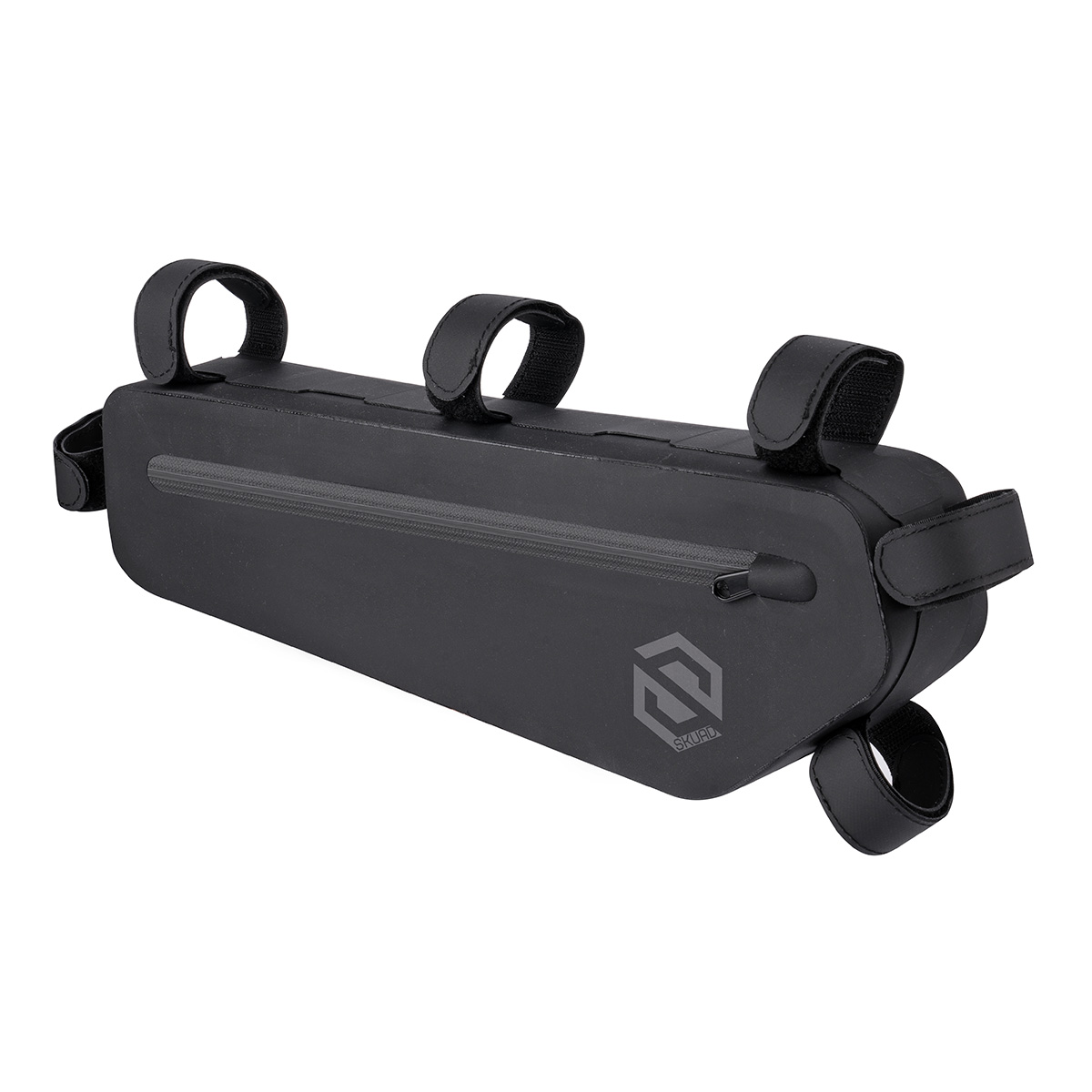 Ruime frametas om aan de bovenbuis te hangen, gemaakt van 600D nylon met TPU-gelamineerde binnenkant. De naadloos gelaste constructie is 100% waterdicht. De binnenkant is versterkt met PVC-profiel om de tas te stabiliseren en de inhoud te beschermen tegen schokken – Hoge weerstand tegen slijtage en scheuren – 6 klittenbandriemen voor veilige bevestiging of verwijdering indien niet nodig – 2 waterdichte ritsen aan de zijkant (1 met inzetstuk voor het opbergen van notities, kaarten, smartphone) – Afmetingen 37 x 12,5 x 6,5 cm; inhoud 3 liter.
