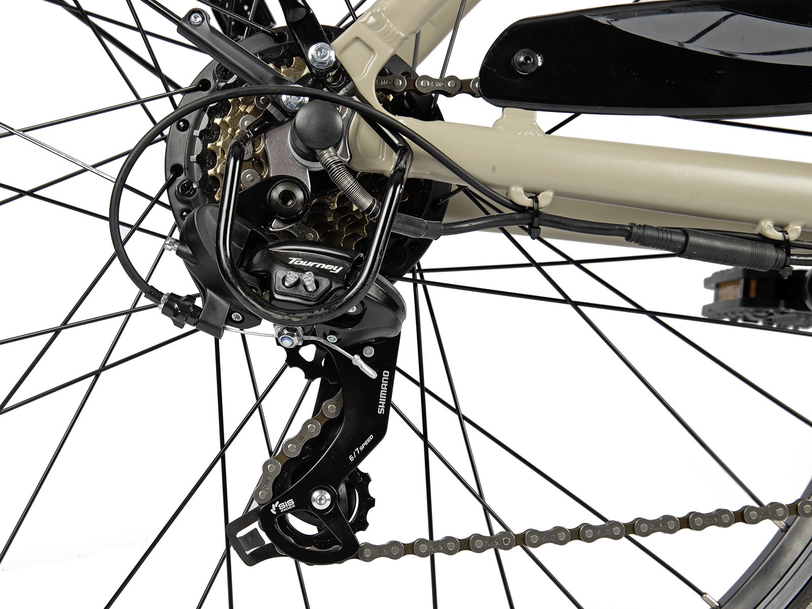 De Amant Eco is een elektrische fiets met achterwielmotor, in het frame geintegreerde 10.4 Ah accu en een 7 versnellingen derailleur. Een fijne fiets voor dagelijks gebruik met een actieradius van ca 80 km, velgremmen en een LCD display waarop snelheid, afstand en de batterijstatus af te lezen zijn. Verlichting op batterijen, bagagedrager achter en een comfortabel zadel.